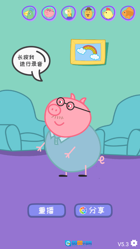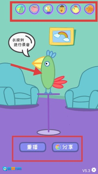 1、打开应用,挑选我们喜爱的动物按钮,随后长按鹦鹉图标开始录音。
