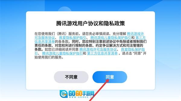 1、仔细阅读【腾讯游戏用户协议与隐私政策】,点击【同意】按钮后,即可进入权限说明界面。