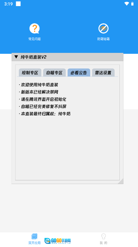 纯牛奶直装本次推出的是v2科技最新版本,专门面向和平精英玩家打造,能够让用户在单部手机上同时运行同一游戏的两个或多个账号进行开黑。该版本新增了绘制专区、自瞄专区与雷达设置等功能板块,其中绘制专区可在腾讯界面初始化加载阶段起到防封作用,还支持主题切换,而背敌提示、雷达显示、骨骼透视、人数统计等功能也都能通过纯牛奶直装V2实现辅助操作。