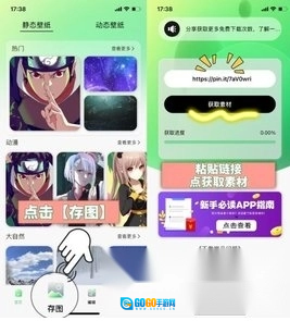 打开【光影存图】应用,点击底部的【存图】按钮,将链接粘贴到指定位置后,点击“获取素材”即可。