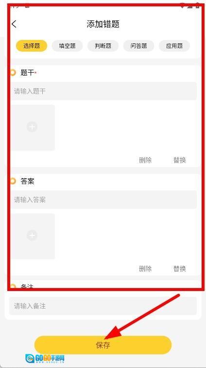4、挑选错题类别,填写题干、答案等相关内容,全部完成后点击保存按键。