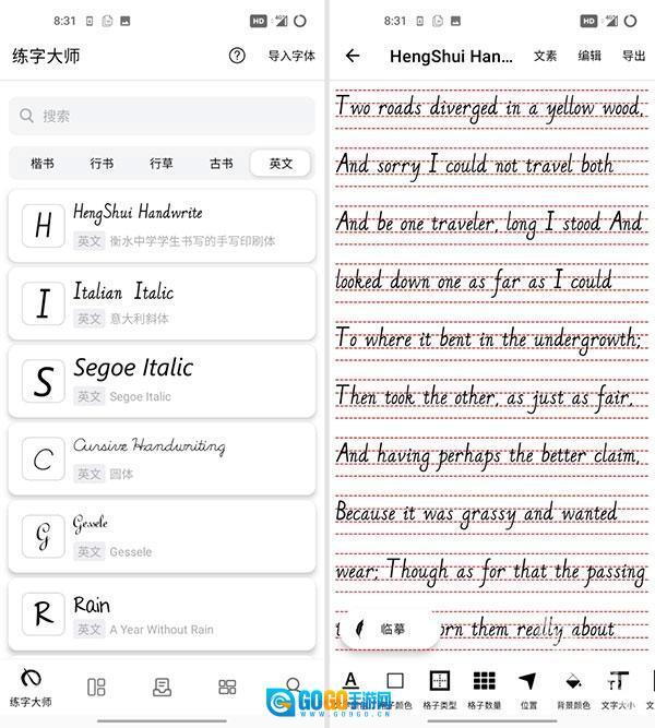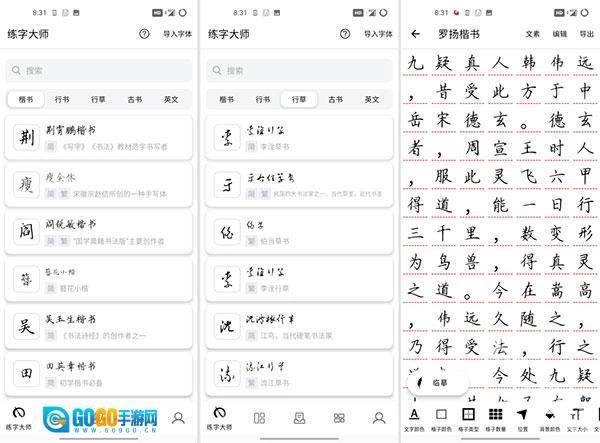 这里能为我们提供丰富多样的字体,像楷书、行书、草书、篆书等,我们都可以依据自身需求挑选不同的字体进行练习。