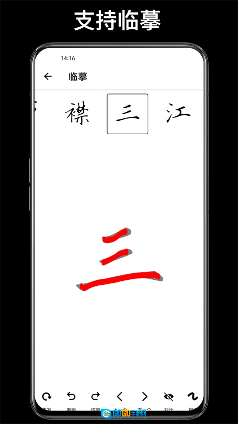 要是没找到想练习的内容,也能自己编辑和导入,不管是网上的还是自己收藏的文章句子都能直接导入,想练什么就练什么。设置好之后,点击临摹就会切换到另一个界面,在这里可以进行对比、调整粗细、选择笔墨颜色、重新书写、撤销操作等等。