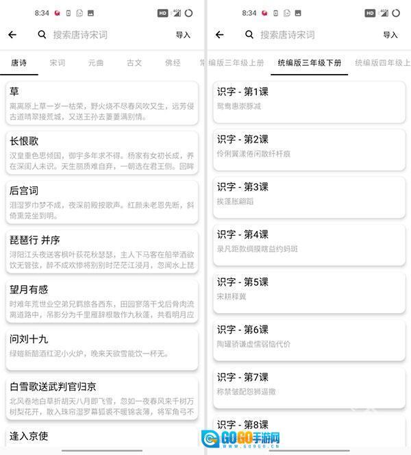 可以点击“文素”,从中挑选App内提供的各类唐诗、宋词以及小学教科书里的文字练习素材。