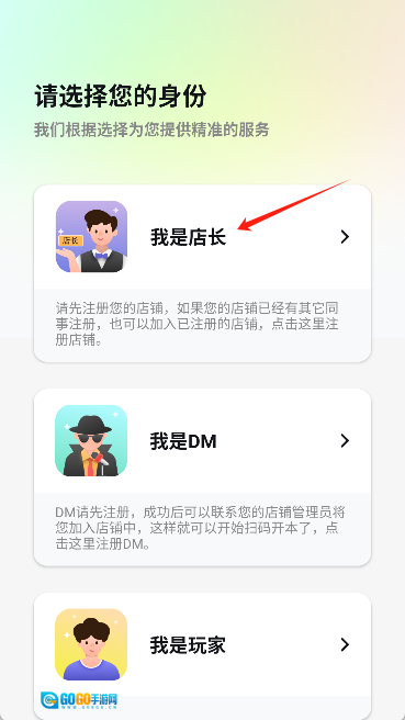 3. 在身份选择页面中选择“我是店长”选项。