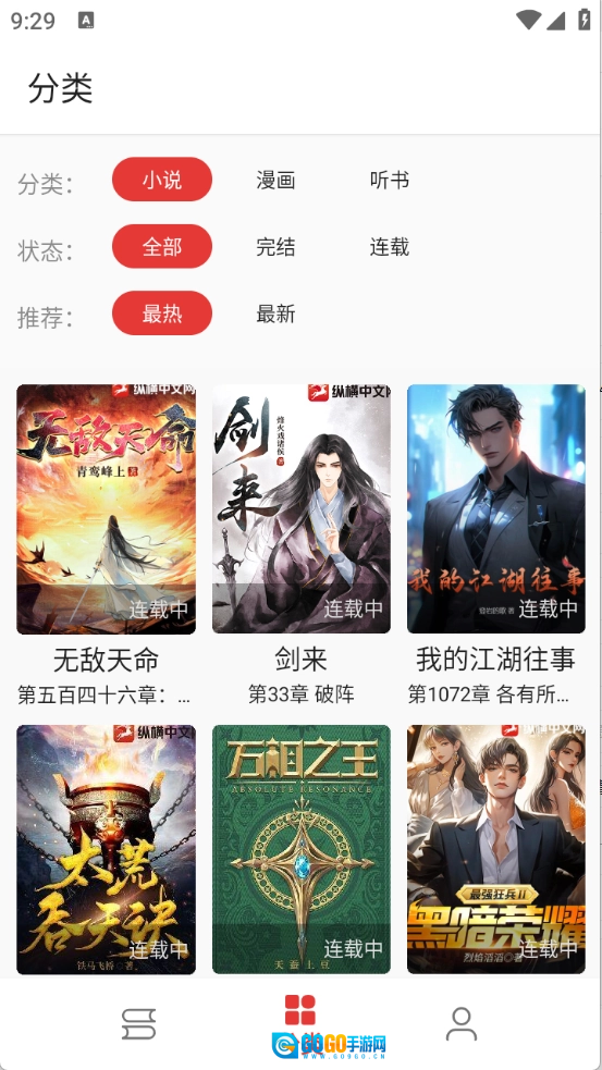 “分类”页面,包含了各种小说以及漫画类型。