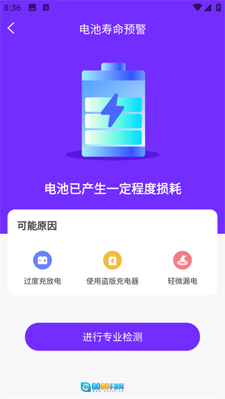 4、电池预警板块还支持专业检测功能,可对当前设备的电池状态进行检测。