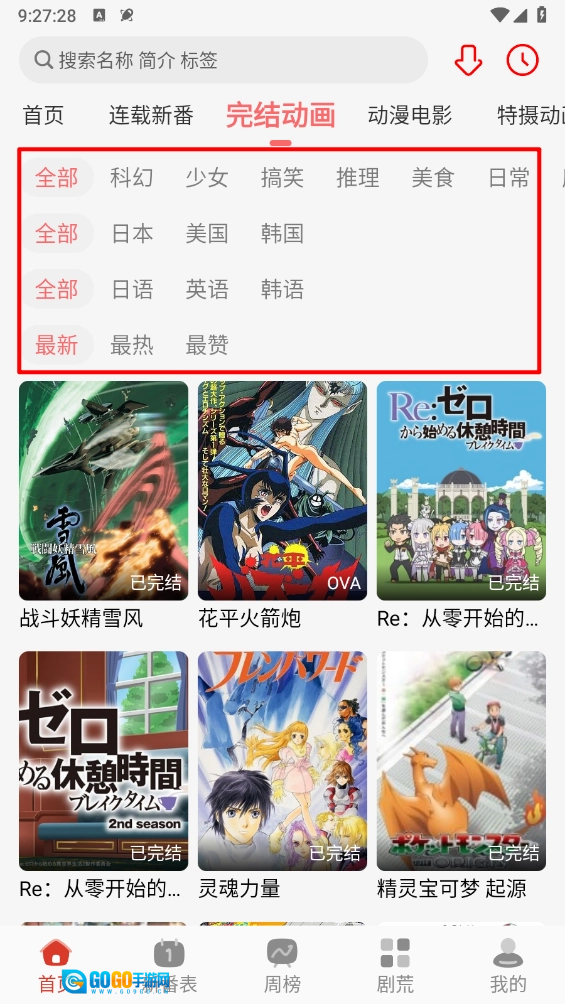 如图所示,切换到“完结动画”页面后,能够依据题材、语言、地区等条件开展筛选操作。