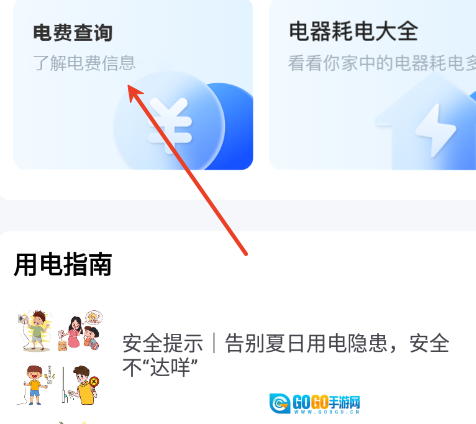 用户需先进入首页,找到“用电”板块,然后进行“电费查询”操作。