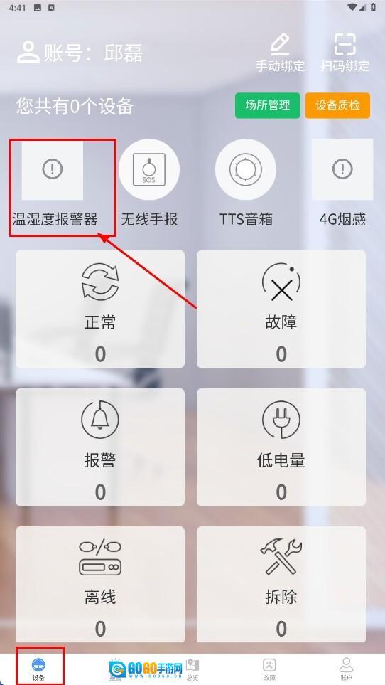 1、在【设备-界面】页面,点击【温湿度报警器】图标,即可进入该设备的管理流程。