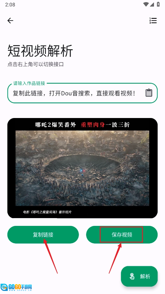 比如开启短视频解析功能,把作品链接粘贴进去,再点击右下角的“解析”按钮。