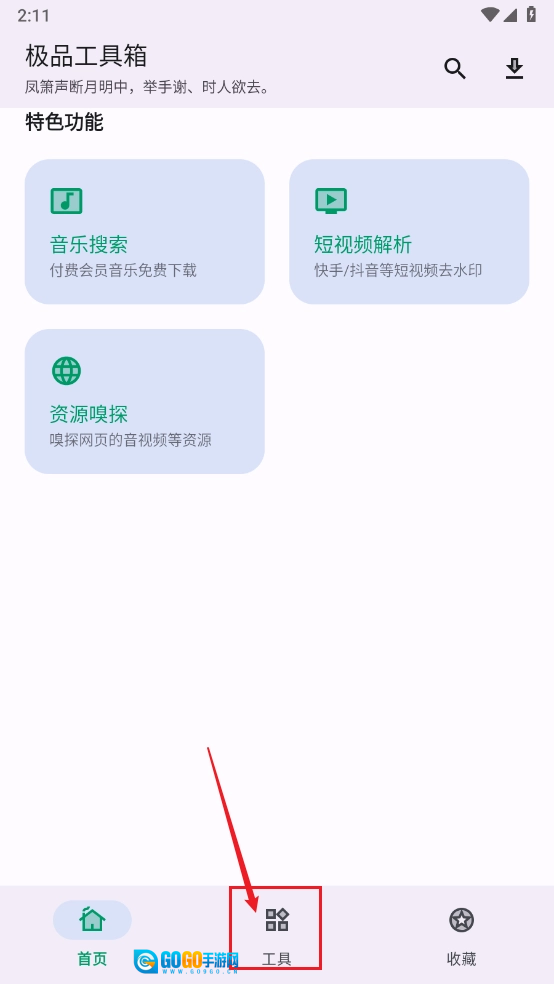极品工具箱是一款整合了多种实用功能的手机工具箱,所有功能都免费开放,无需付费,在里面一键点击就能使用。它不仅包含音乐搜索和免费服务,还拥有资源探测、短视频解析等功能,并且支持一键添加到收藏夹。