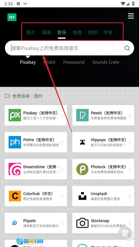 进入后根据所需一键搜索相关音乐、图片等资源。