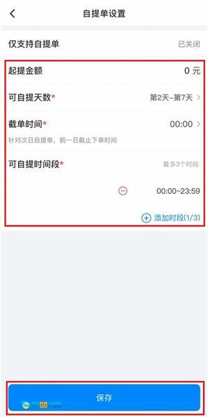 5、对自提单的金额、天数等信息进行设置,完成后点击【保存】按钮即可。