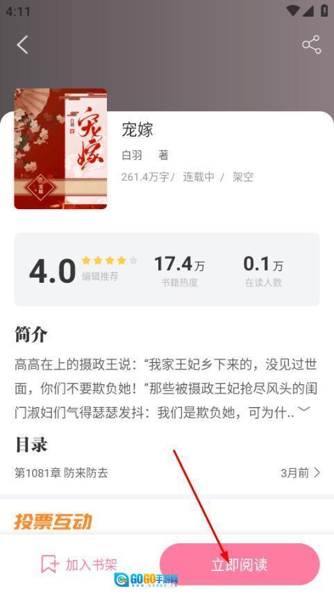4、在该书详情页面,点击立即阅读,开始阅读宠嫁。