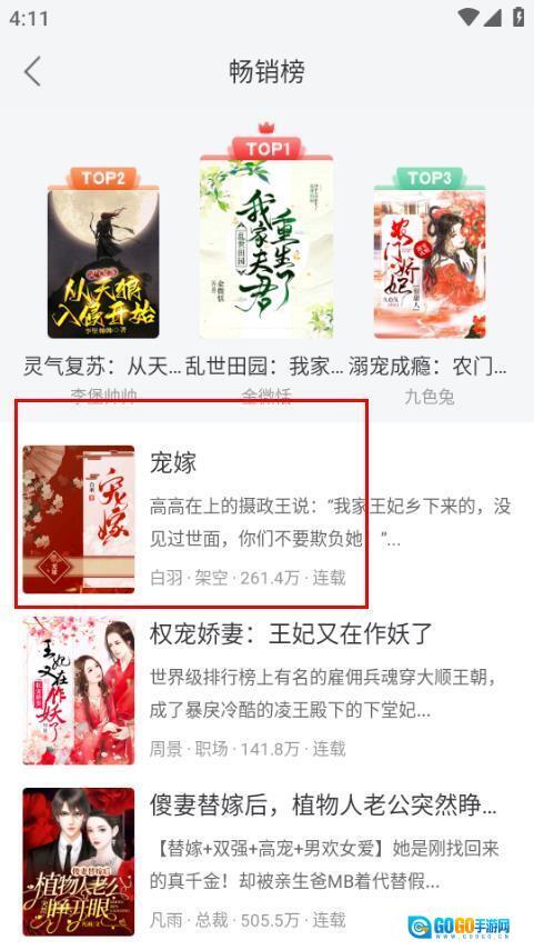 2、在排行页面里,找到畅销榜中的宠嫁并点击,就能进入畅销榜的宠嫁详情页面啦。