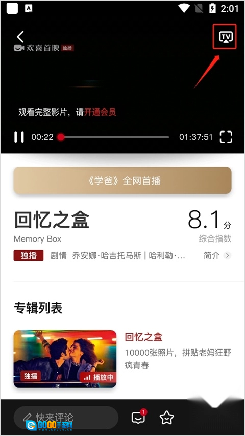 2、进入播放页面后,视频窗口的右上角会出现一个电视样式的图标。