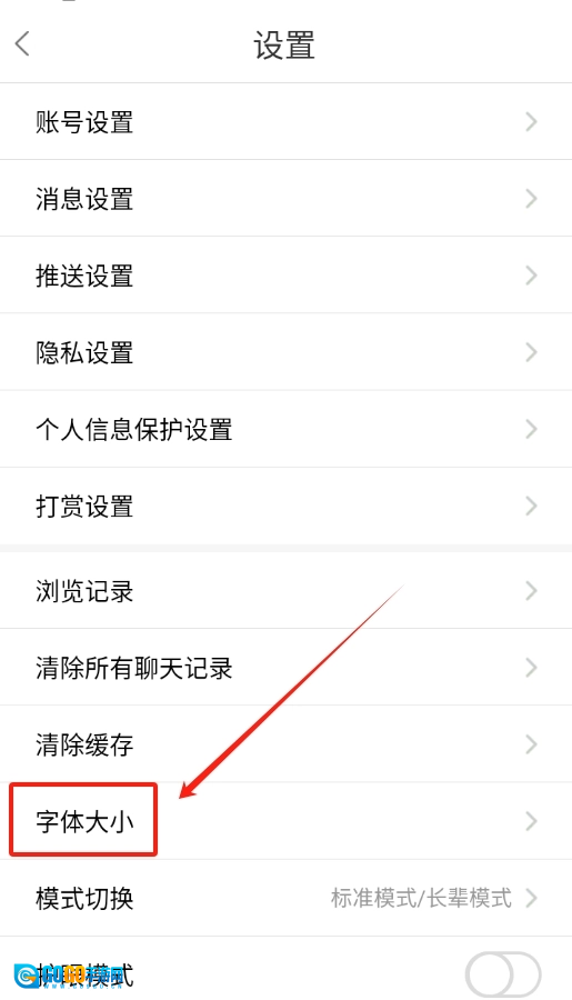 2、进入设置页面后,找到“字体大小”选项并点击它。