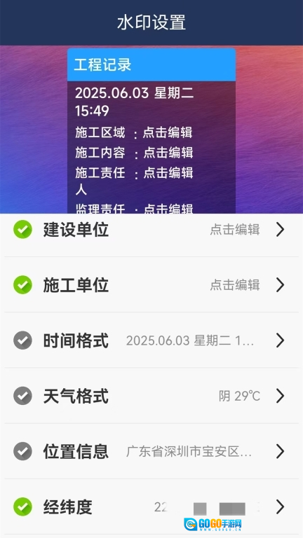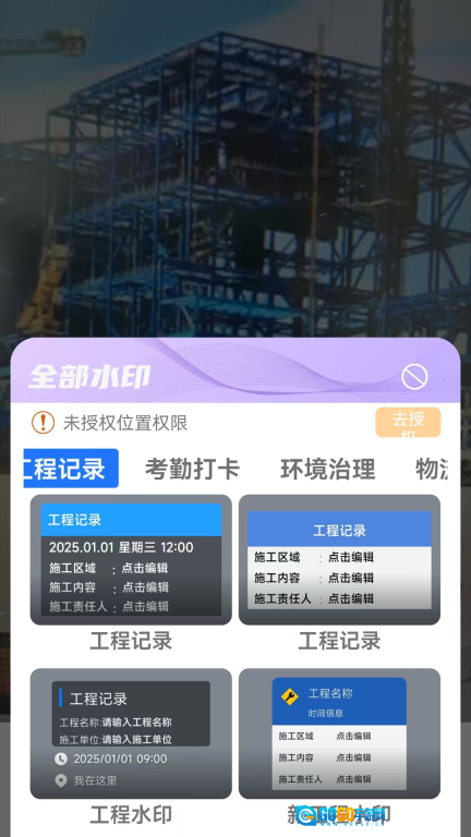 2.时间地点水印、工程水印、考勤打卡、天气水印、生活记录、物业管理水印、打卡水印等多套模板,真实还原多种工作和生活场景,满足不同相机用户对水印样式的需求。