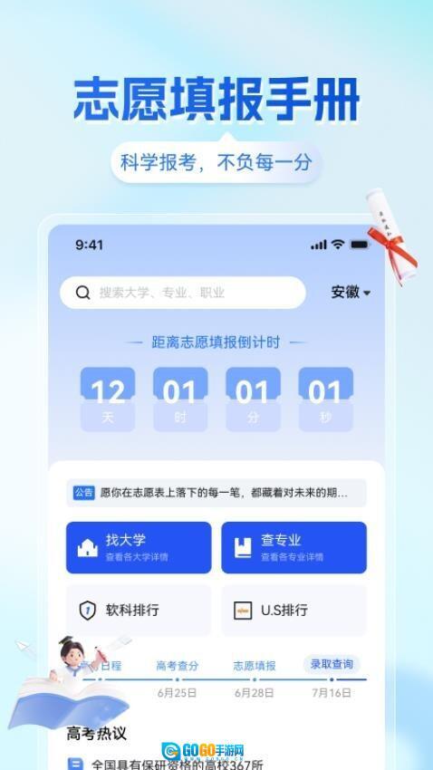 《高考志愿填报手册指南》是一款助力高考学子轻松锁定理想院校与专业的实用工具软件。它一站式满足用户在志愿填报倒计时提醒、院校查询、排名检索及热门话题了解等方面的需求。除了提供海量院校与专业资讯外,还能依据考生的个体情况给出定制化推荐,协助考生及家长更理性地开展志愿填报工作。借助这款软件,考生能够更高效地完成志愿填报流程,有效规避因信息匮乏或决策偏差对未来大学学业及职业发展规划造成的不利影响。