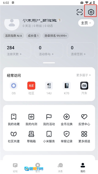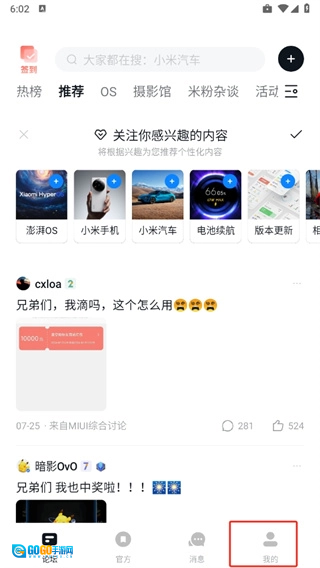 1、首先打开小米社区应用,进入首页后可切换至消息、我的等页面,我们点击右下角的【我的】;