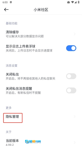 3、接下来进入设置页面,这里有清除缓存、关闭私信、隐私设置等功能选项,我们需要点击的是【隐私管理】。