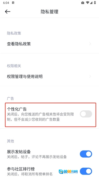 4、最后点击进入隐私管理页面后,找到【个性化广告】选项,点击其后方的按钮将其关闭即可;