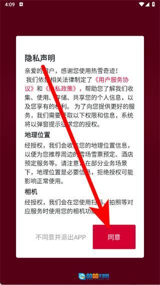 1、启动热雪奇迹应用,当弹出隐私声明窗口时,点击窗口中的同意按钮。