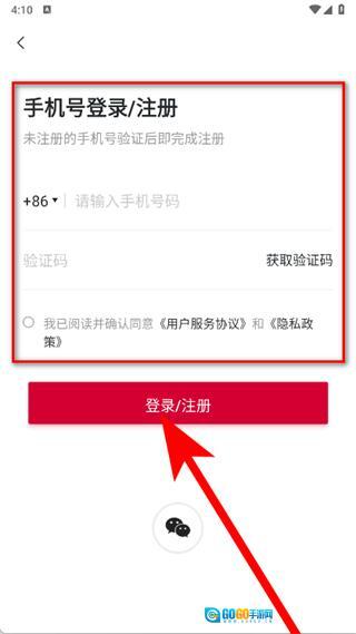 4、请输入手机号码,点击“获取验证码”按钮,输入收到的验证码,勾选相关选项后,点击“登录注册”按钮,即可完成注册操作。