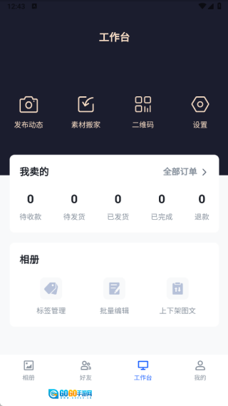 在工作台页面,你可以查看发布动态、进行素材搬家操作,同时也能了解到自己的订单信息。