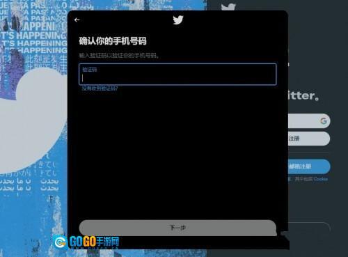 4、接着,我们会进入手机短信验证码的验证页面,将Google voice收到的验证码输入到对应的方框里,点击下一步,完成头像上传后,就能进入推特了。