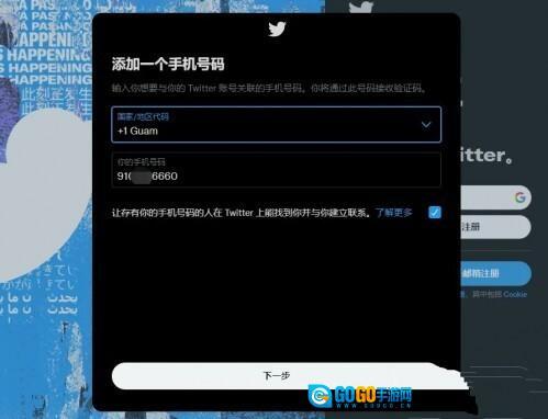 3、进入填写手机号的选项页面,在此处输入我们提前准备好的Google Voice号码,需要注意的是:地区代码应选择+1Guam,具体可参考下方图示。
