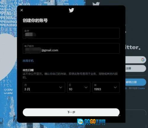 1、打开推特后,映入眼帘的是其主页,主页上设有注册按钮,此时我们需点击邮箱注册选项,而非手机注册按钮。在弹出的界面中,依次填写好姓名、邮箱地址、出生日期等相关信息,随后点击下一步即可。