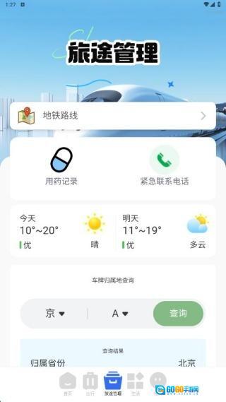 3、在旅途管理页面,除了支持用药记录、本地天气等更多信息外,还能快速查询车牌归属地。