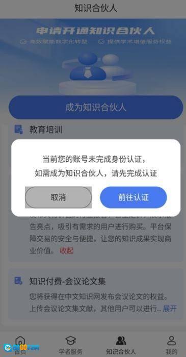1、在“知识合伙人”板块中点击“成为知识合伙人”选项,进入学者身份认证流程。