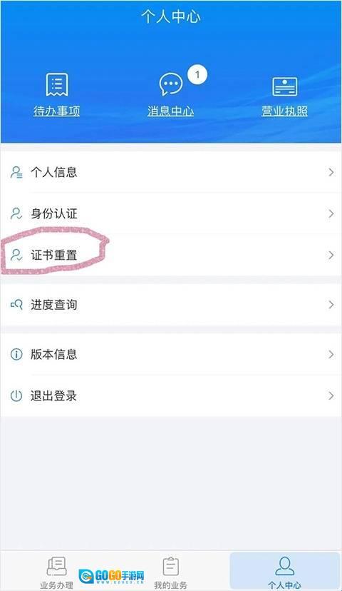 2、登录后,点击右下角的个人中心,找到证书重置选项,先自行设置一个证书密码。