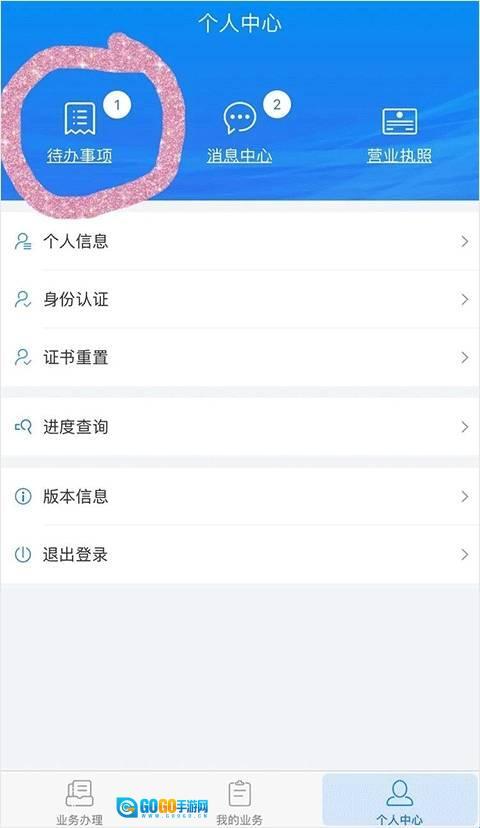 3、设置好证书密码后返回个人中心界面,点击左上角的待办事项。