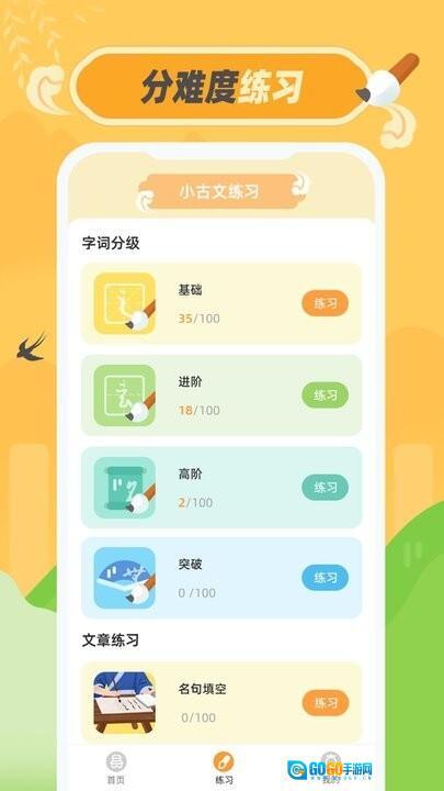 【字词分级练习】为适配不同学习阶段的需求,专门划分了4个难度层级。