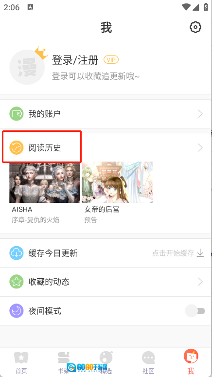 1、在我的页面点击“阅读历史”。