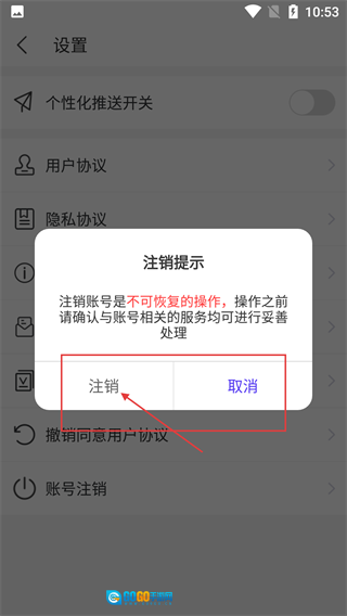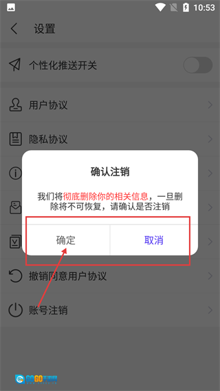 4、此时会弹出【确认注销】的弹窗,其中会提示相关信息删除后将无法恢复,点击弹窗中的【确定】按钮,就能完成账号注销的操作。
