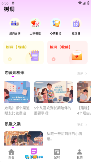 2、树洞页面里设有经典台词、土味情话、心情日记、纪念日等板块,用户还能在这里写信和收信。