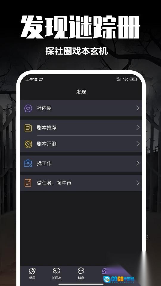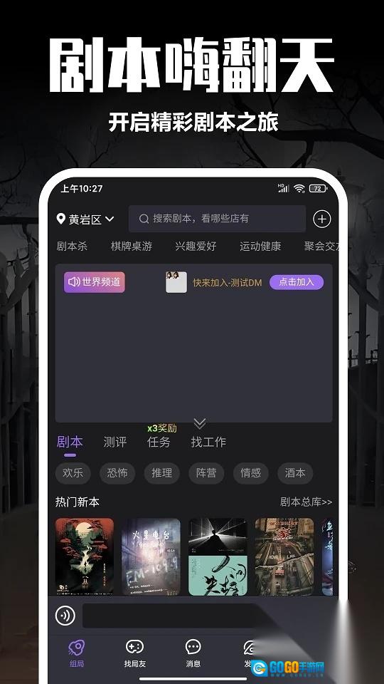 1、在组局页面里,你能够了解到各式各样的剧本,同时页面中还设有多种不同的版块。