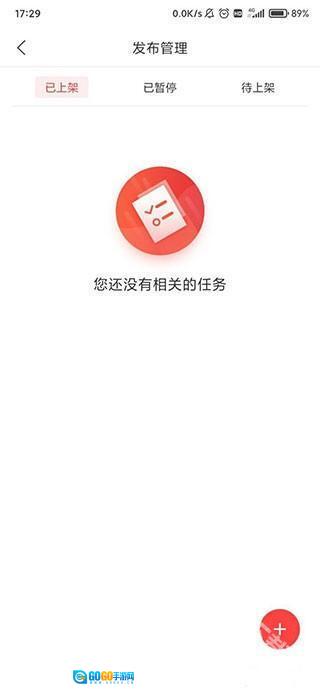 2、点击发布管理,首次发布任务时,平台会先呈现一些规则类题目供用户选择,完成后进入该界面,点击右下角的+号,即可进入发布任务的界面。