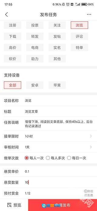 4、选好类型与支持设备后,项目名称可填写为“浏览+平台”的形式,该名称会作为标题的标签,因此标题处填写“浏览文章”即可。接下来是任务说明部分,这里可以写明相关注意事项与具体要求,例如要求阅读时长、使用何种工具阅读等内容。