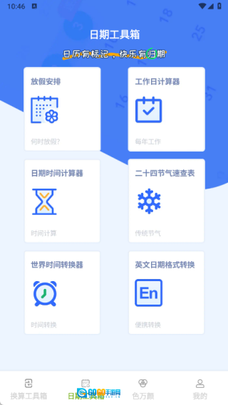 3、日期工具箱页面包含放假安排、工作日计算器、日期时间计算器、二十四节气速查表、世界时间转换器以及英文日期格式转换功能。