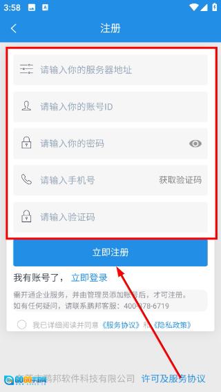 3、进入注册页面后,按顺序填写服务器地址、账号ID、密码、手机号,获取验证码并填入,勾选相关协议后点击“立即注册”按钮,就能完成账号注册流程。