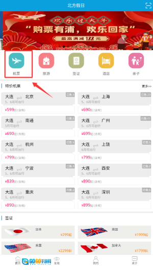 1、打开北方假日应用后,在首页的导航栏里找到并点击“机票”选项,进入航班查询界面。