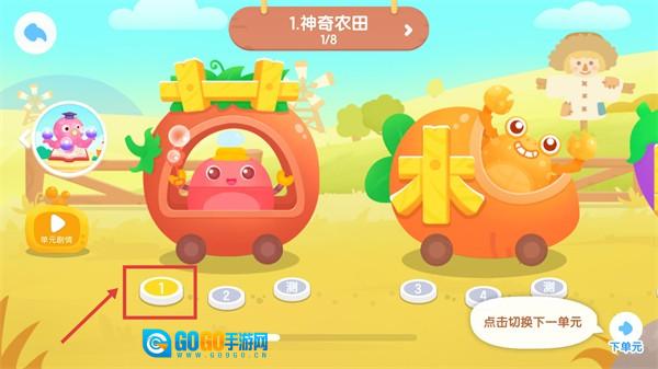 进入【1.神奇农田-1/8】场景后,会看到带有数字标识的关卡按钮,点击标有【1】的按钮即可进入相应关卡进行学习。