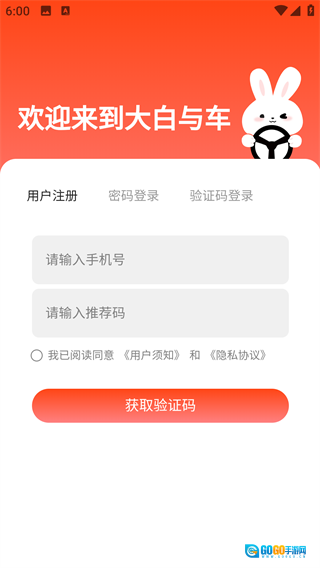 2、输入手机号,推荐吗,获取验证码即可完成注册;