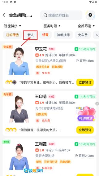 2、在技师选择页面,点击新人标签后,即可筛选出新人技师的列表。